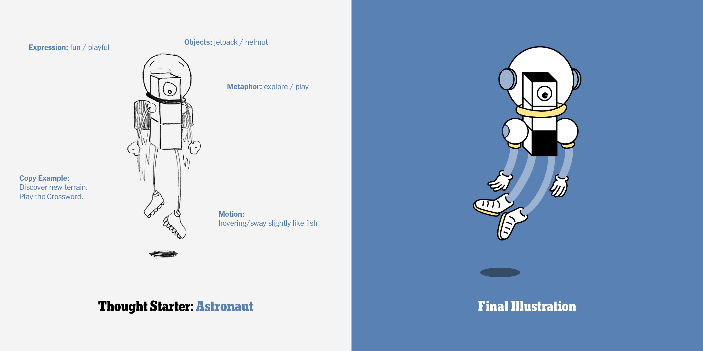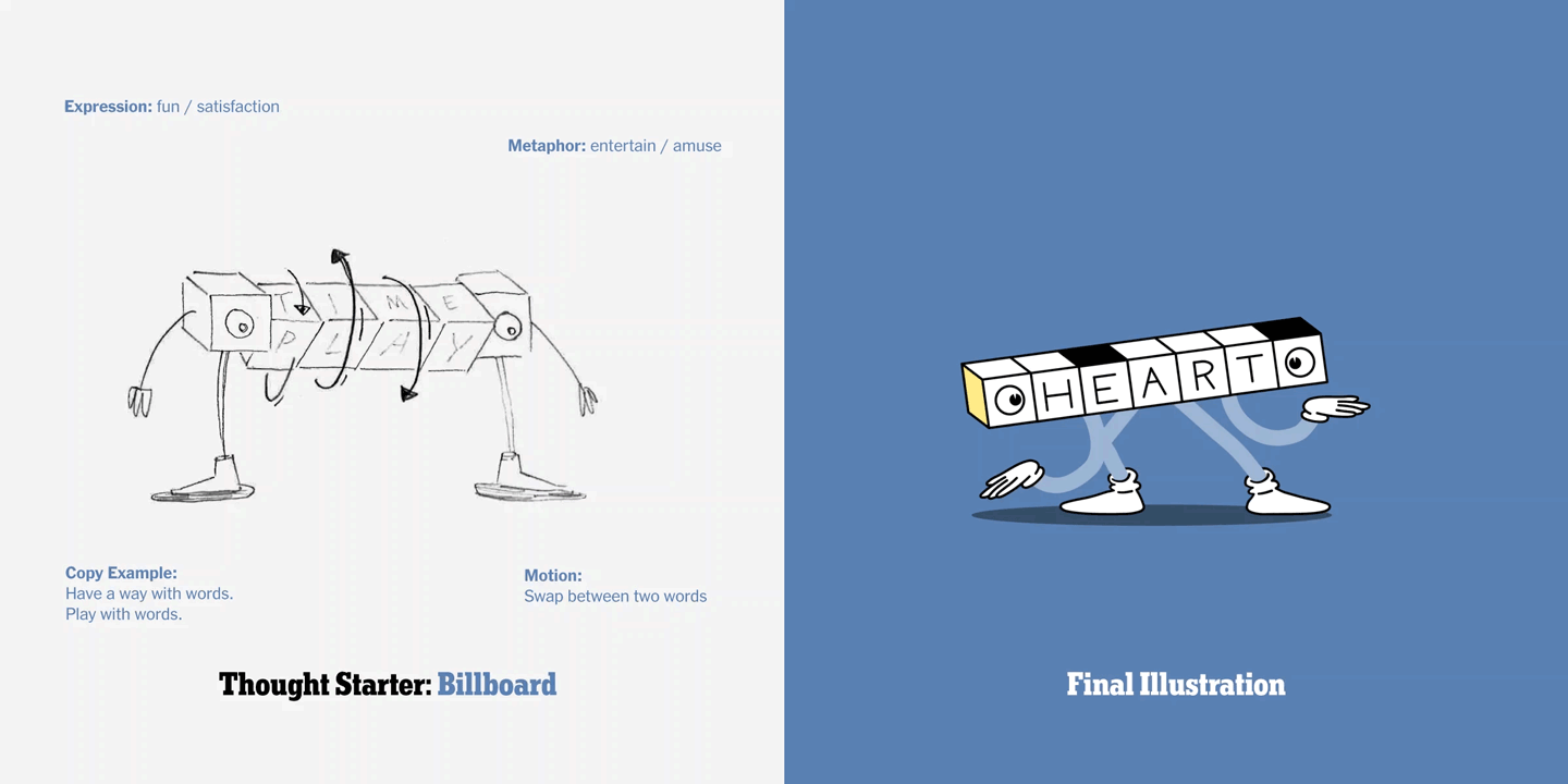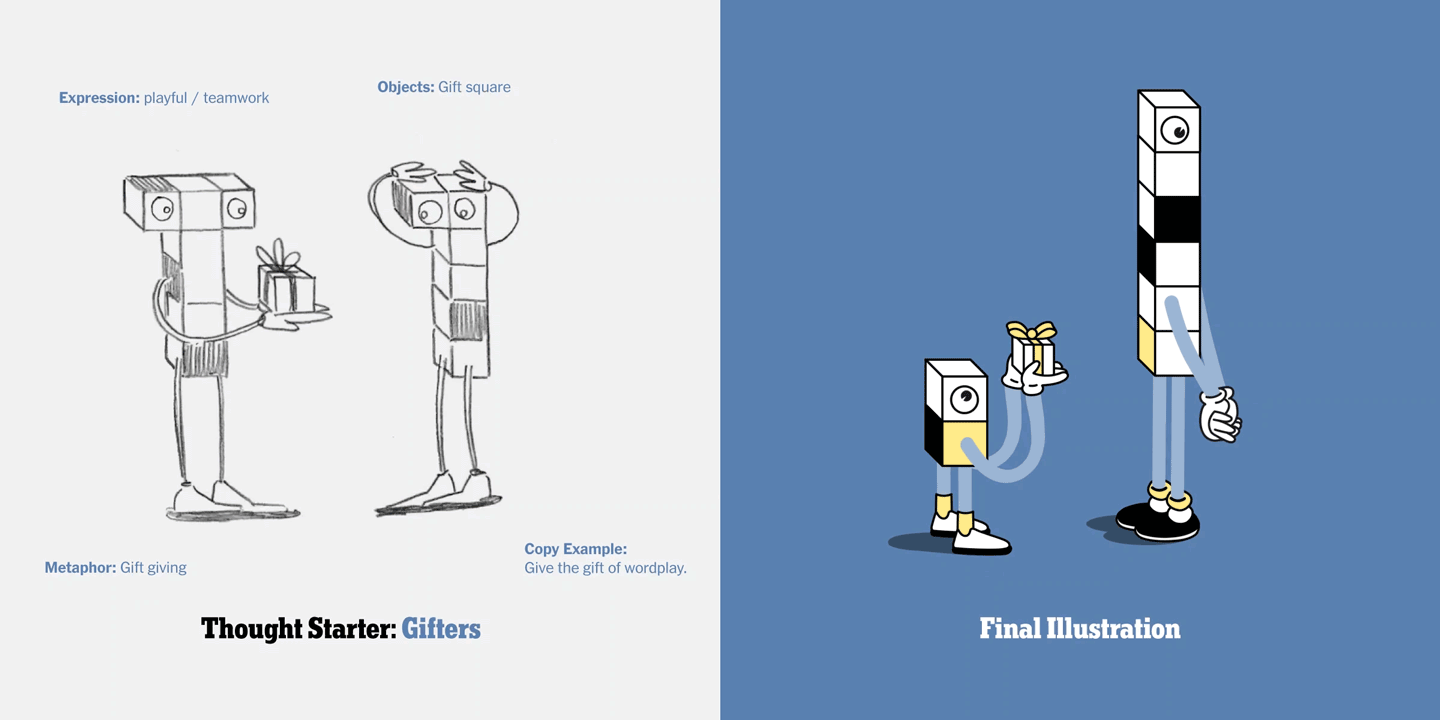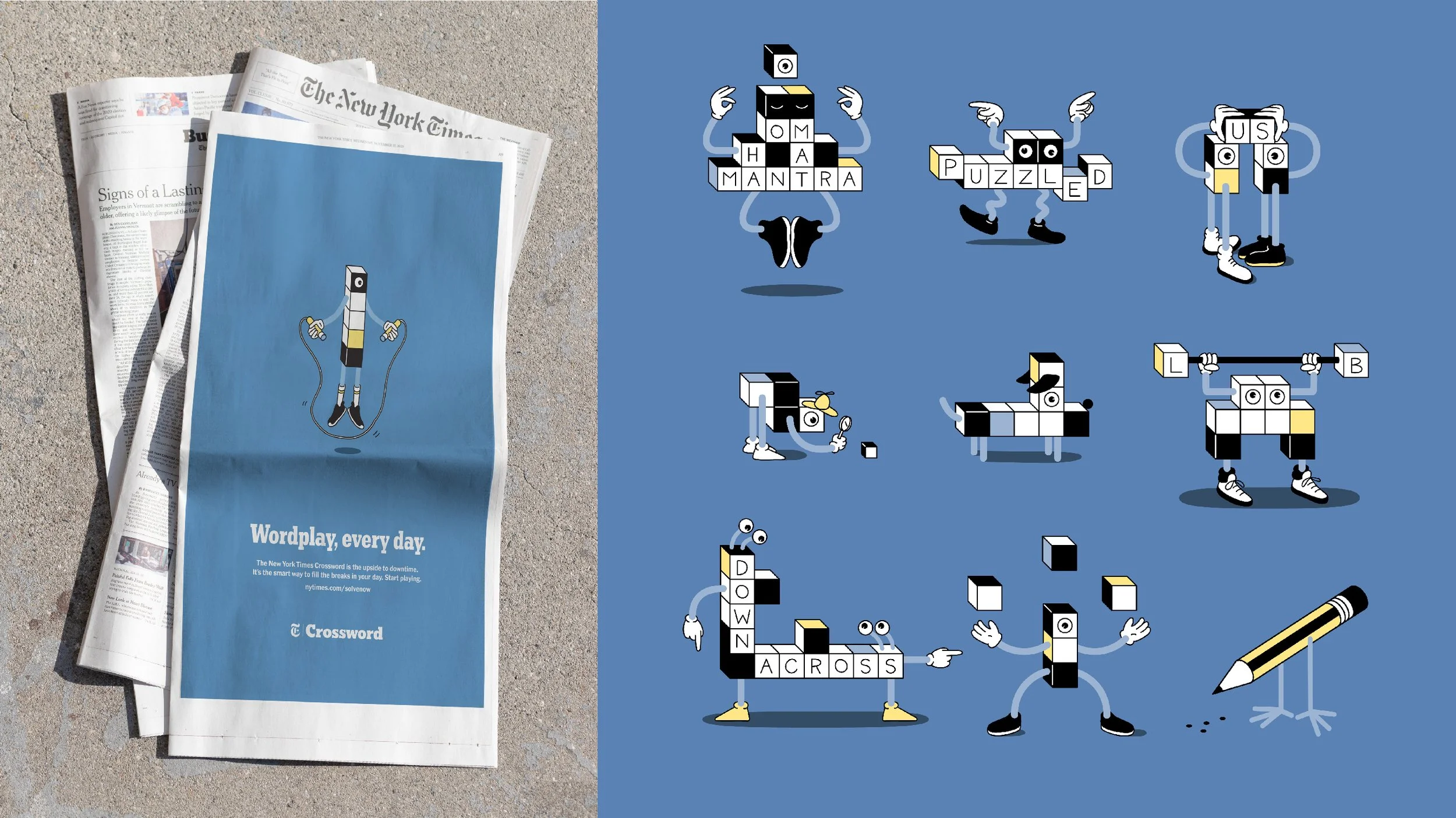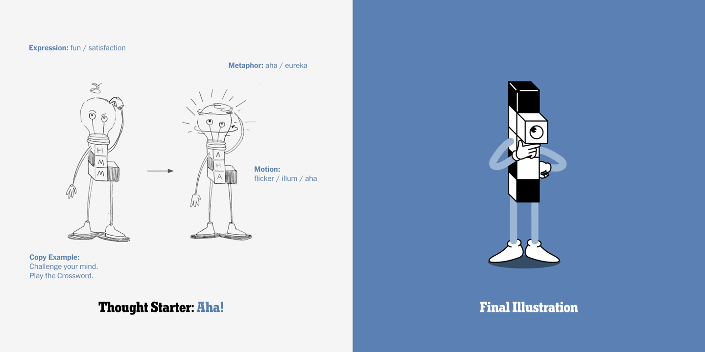 Working with a talented team of writers, illustrators and designers I helped bring the famous New York Times Crossword puzzle to life. Tasked with marketing the traditionally black and white puzzle, the team and I built a lively universe centered around “puzzle people” and the complex interworking of “Life within the grid”.